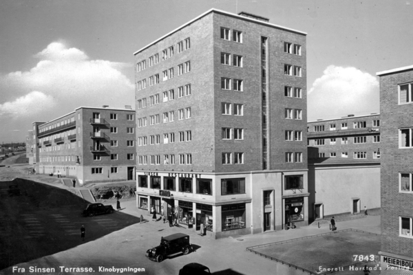 Etter at dette innlegget ble postet, tok Ketil Næss kontakt, og vi har gjort noen endringer i teksten. Han forteller at Sinsen Restaurant, lå i andre etasje på Sinsen kino (1937-1964) i Trondheimsveien 163, cirka 200 meter høyere opp. Dette bildet tatt i 1937 viser at Næss har rett. Her ser vi at det står «Sinsen restaurant» på skiltet utenfor.
